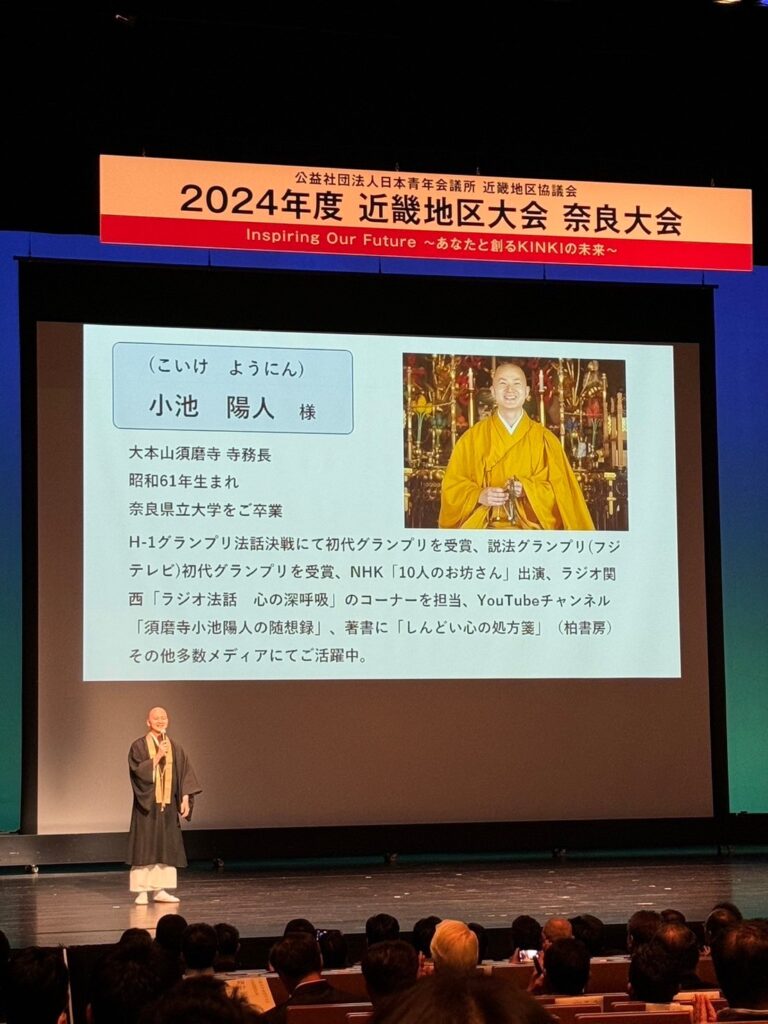 大会式典では、冒頭、法話者のNo.1を決める「H-1グランプリ」の初代チャンピオンである、小池陽人(ようにん)様にご説示いただきました。法話の内容は、豊かな未来と幸福な人生を構築するためのきっかけやヒントになるもので大変有意義なものでした。