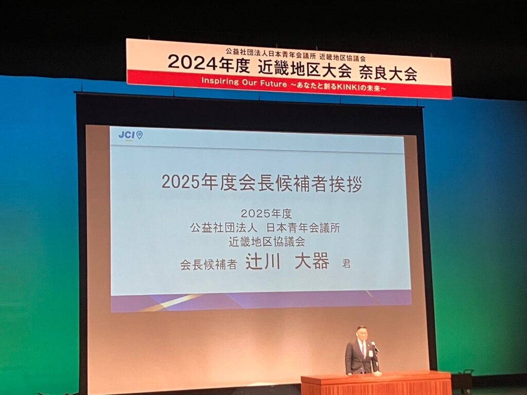 その後、次年度会長候補者である和歌山JC所属の辻川大器君から挨拶がありました。次年度会長の魂を焦がす思いが会場全体に伝播し、メンバー一丸となって盛り立てていこうという気運が高まりました。
