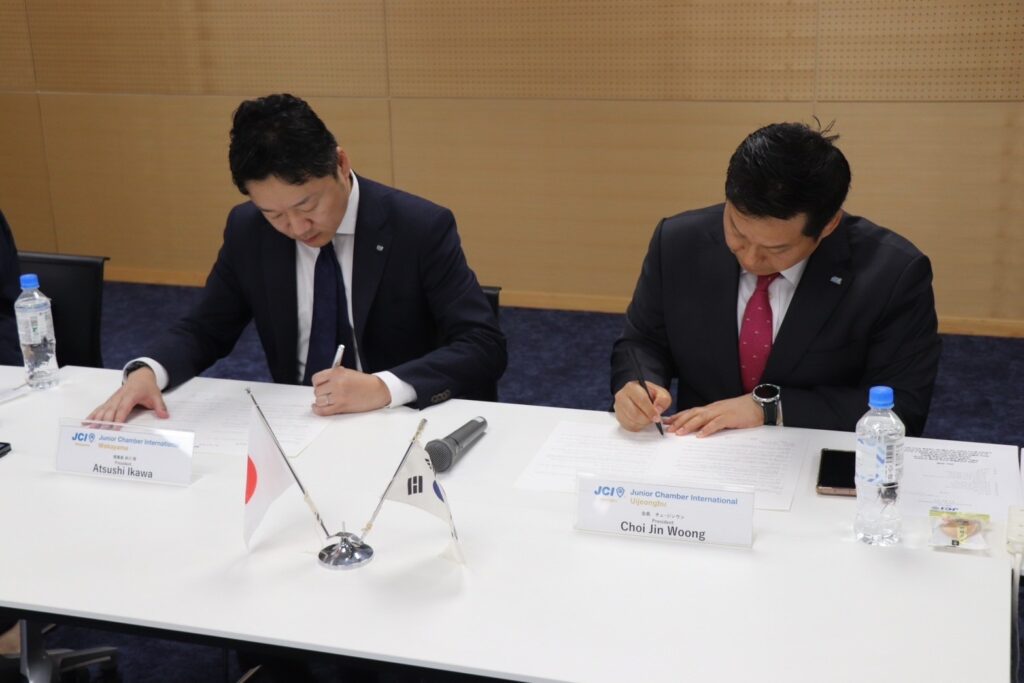 わんぱく相撲の見学では、真剣に戦う子供たちの姿に一喜一憂しながら、議政府JCの皆さまも大盛り上がりでした。公式会議では、お互いの近年の取り組みについての紹介や姉妹JC確認書(姉妹締結書)の更新を行いました。また、昨年迎えた姉妹関係50周年を祝って、記念品の交換も行いました。
