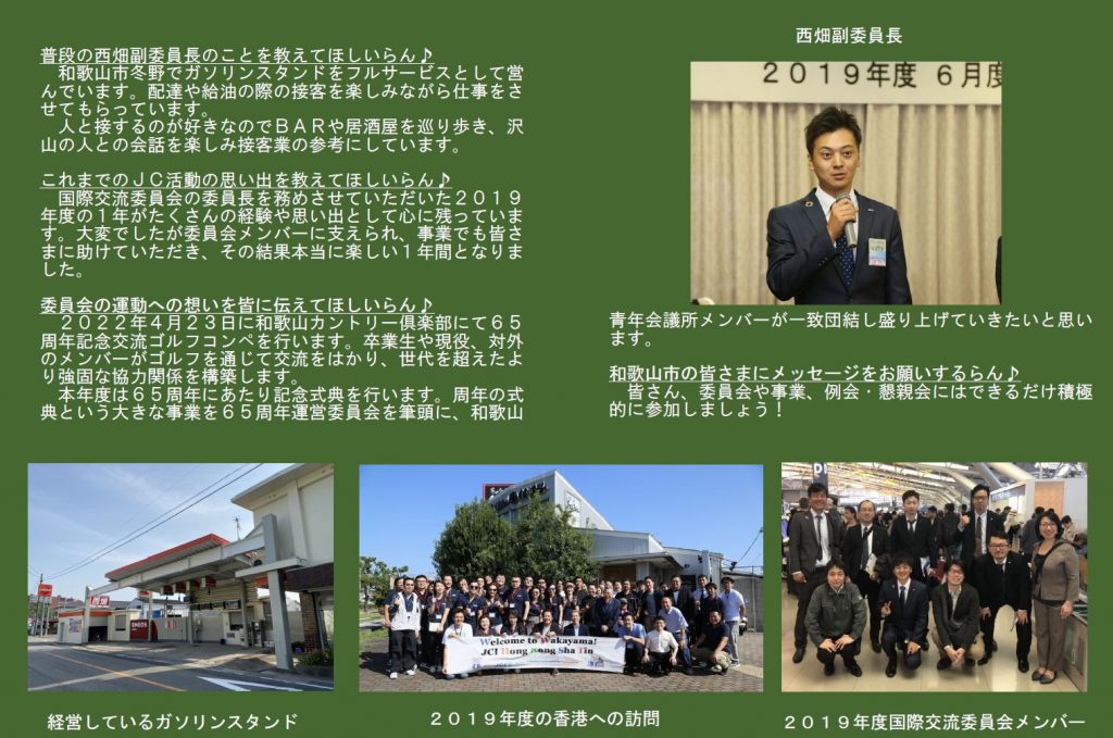 本年度は「わとらんインタビュー」と題し、和歌山青年会議所のメンバーにわとらんがお話を伺って、担当事業や青年会議所運動への意気込みを紹介します。今回は、 65周年運営委員会副委員長 西畑元博君 にお話を伺います 。