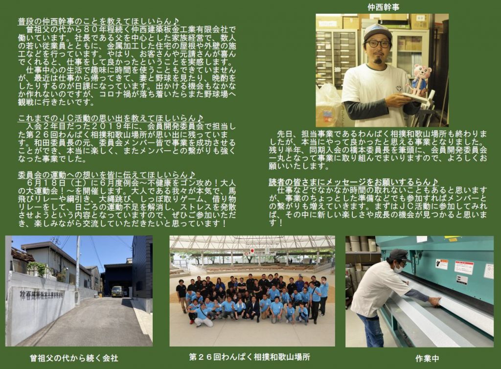 本年度は「わとらんインタビュー」と題し、和歌山青年会議所のメンバーにわとらんがお話を伺って、担当事業や青年会議所運動への意気込みを紹介します。今回は、 会員開発委員会幹事 仲西雄亮君にお話を伺います 。