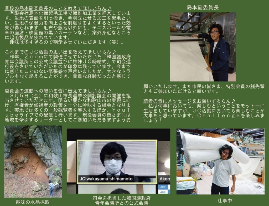 本年度は「わとらんインタビュー」と題し、和歌山青年会議所のメンバーにわとらんがお話を伺って、担当事業や青年会議所運動への意気込みを紹介します。今回は、 総務広報委員会副委員長 島本和典君にお話を伺います 。