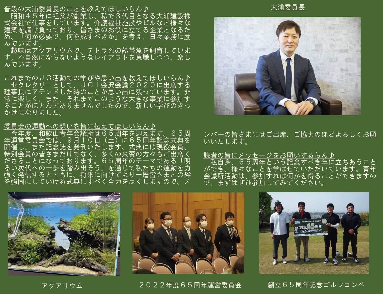 本年度は「わとらんインタビュー」と題し、和歌山青年会議所のメンバーにわとらんがお話を伺って、担当事業や青年会議所運動への意気込みを紹介します。今回は、65周年運営委員会 委員長 大浦正嗣君にお話を伺います 。