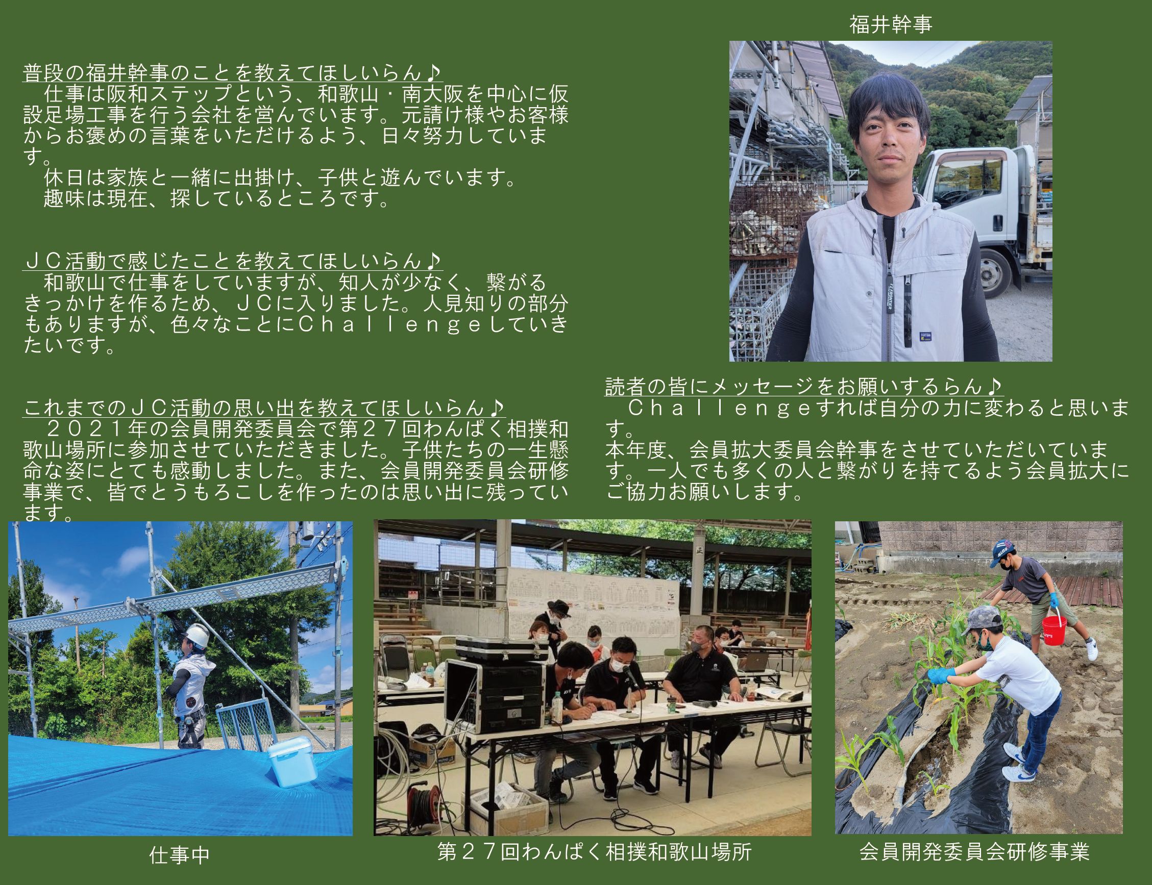本年度は「わとらんインタビュー」と題し、和歌山青年会議所のメンバーにわとらんがお話を伺って、担当事業や青年会議所運動への意気込みを紹介します。今回は、会員拡大委員会 幹事 福井貴士君にお話を伺います 。