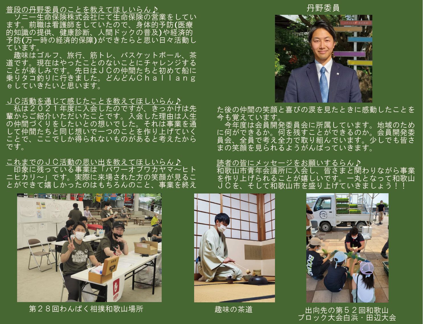 本年度は「わとらんインタビュー」と題し、和歌山青年会議所のメンバーにわとらんがお話を伺って、担当事業や青年会議所運動への意気込みを紹介します。今回は、会員開発委員会 委員 丹野康平君にお話を伺います 。