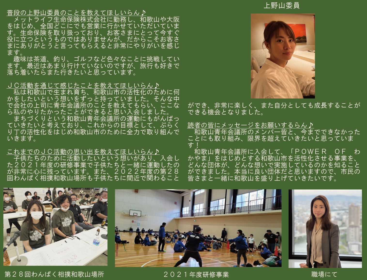 本年度は「わとらんインタビュー」と題し、和歌山青年会議所のメンバーにわとらんがお話を伺って、担当事業や青年会議所運動への意気込みを紹介します。今回は、会員開発委員会 委員 上野山真衣君にお話を伺います 。