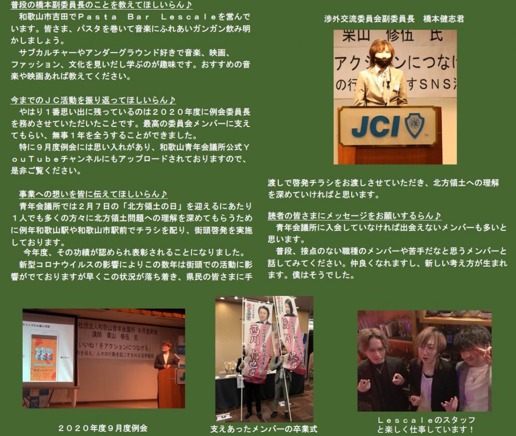 本年度は「わとらんインタビュー」と題し、和歌山青年会議所のメンバーにわとらんがお話を伺って、担当事業や青年会議所運動への意気込みを紹介します。今回は、渉外交流委員会副委員長 橋本健志君にお話を伺います。