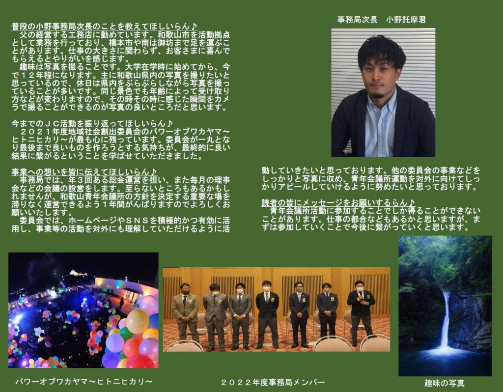 本年度は「わとらんインタビュー」と題し、和歌山青年会議所のメンバーにわとらんがお話を伺って、担当事業や青年会議所運動への意気込みを紹介します。今回は、事務局次長 小野託摩君にお話を伺います 。