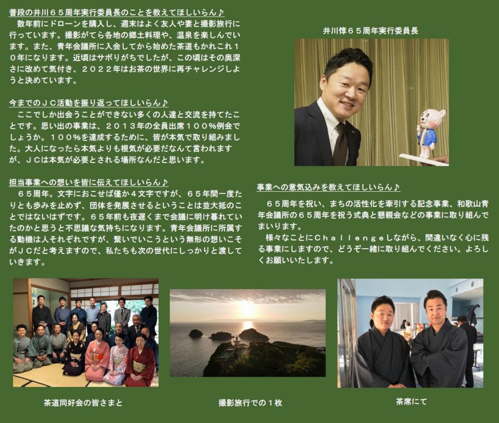 本年度は「わとらんインタビュー」と題し、和歌山青年会議所のメンバーにわとらんがお話を伺って、担当事業や青年会議所運動への意気込みを紹介します。今回は65周年記念事業、65周年式典・懇親会について、65周年実行委員会委員長 井川惇君にお話を伺います。
