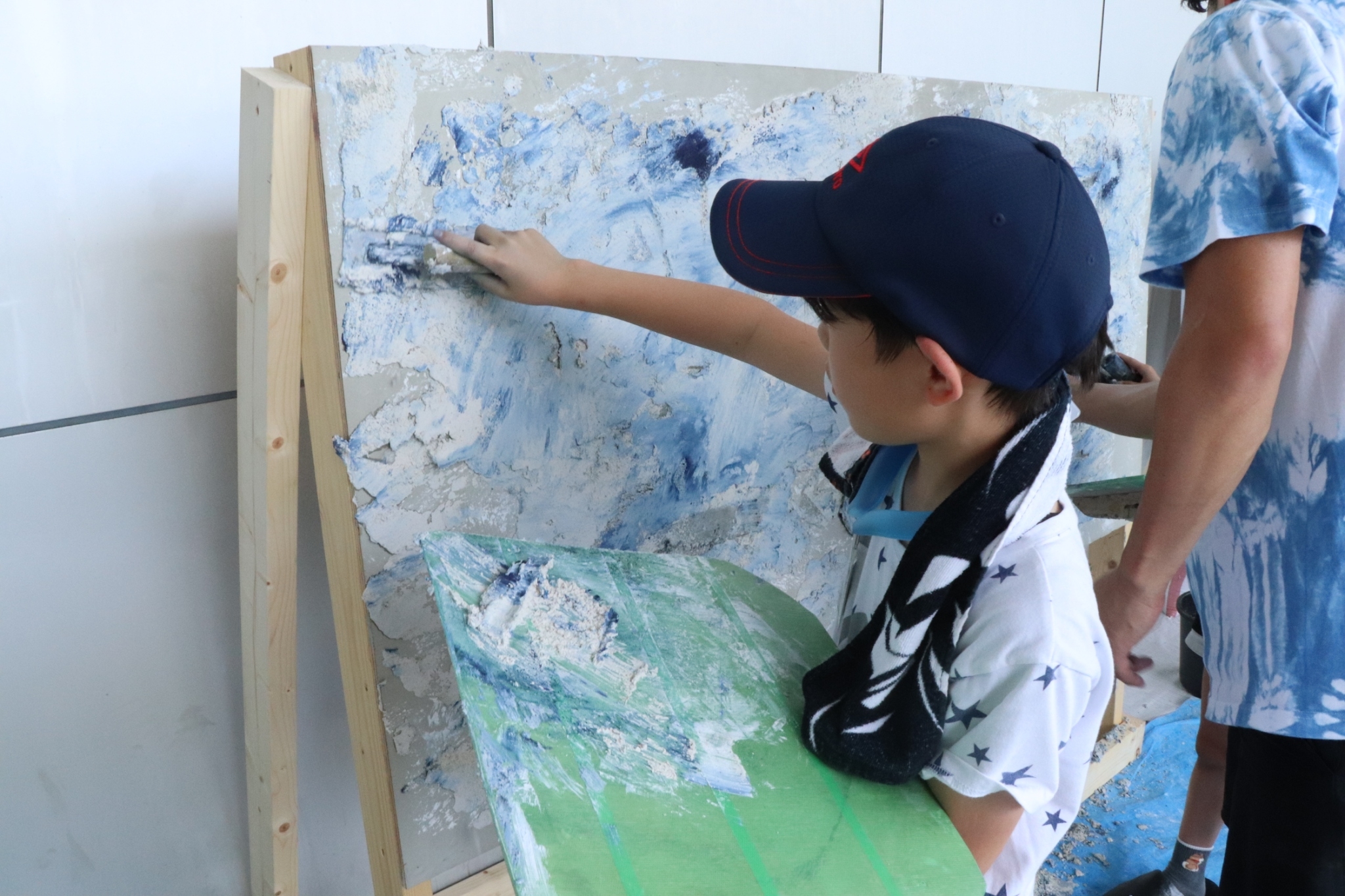 和歌山 藍 PROJECT~藍&PEACE~ 日本伝統の藍と現代左官を世界で初めて融合させた、初代藍左師 守谷怜太さんに講師として来ていただき、和歌山県立近代美術館にて和歌山市内小学校を対象にした課外事業を行いました。