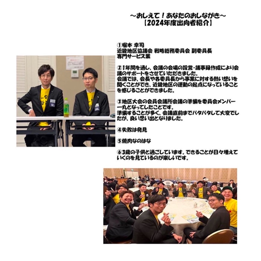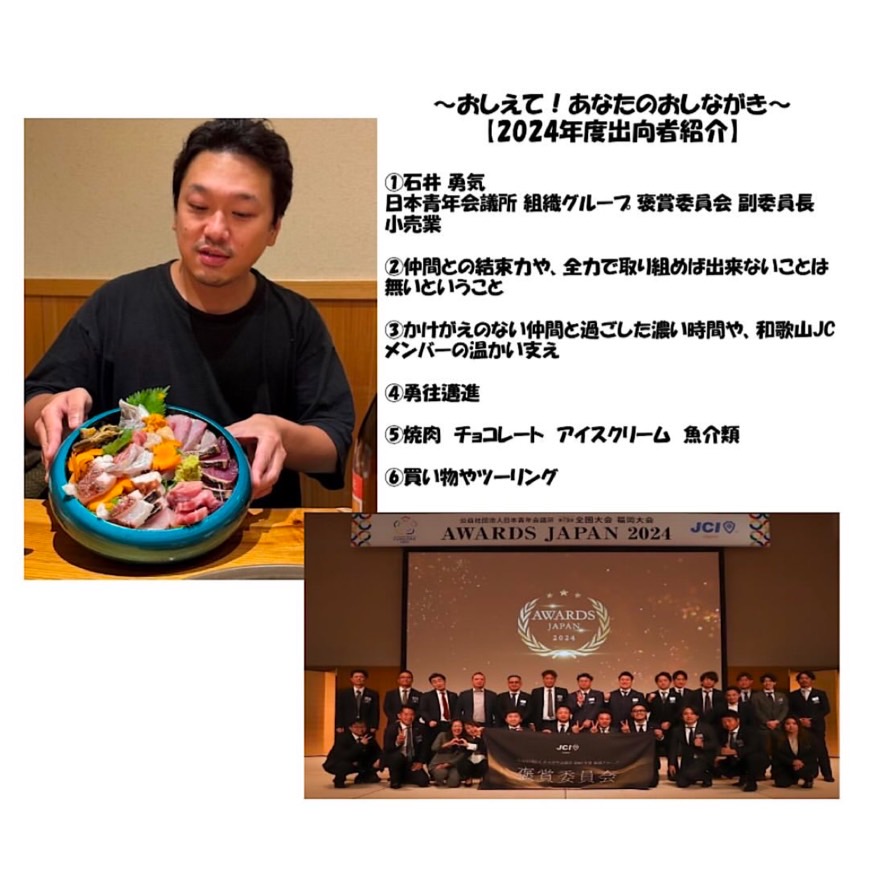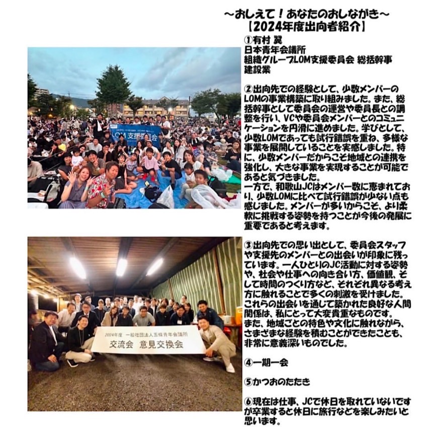 2024年度も和歌山JCには、各メンバーが様々な出向先で活躍してくれています。この特集では、出向者の皆さまに質問に答えていただき、そのキャラクターに迫ります!