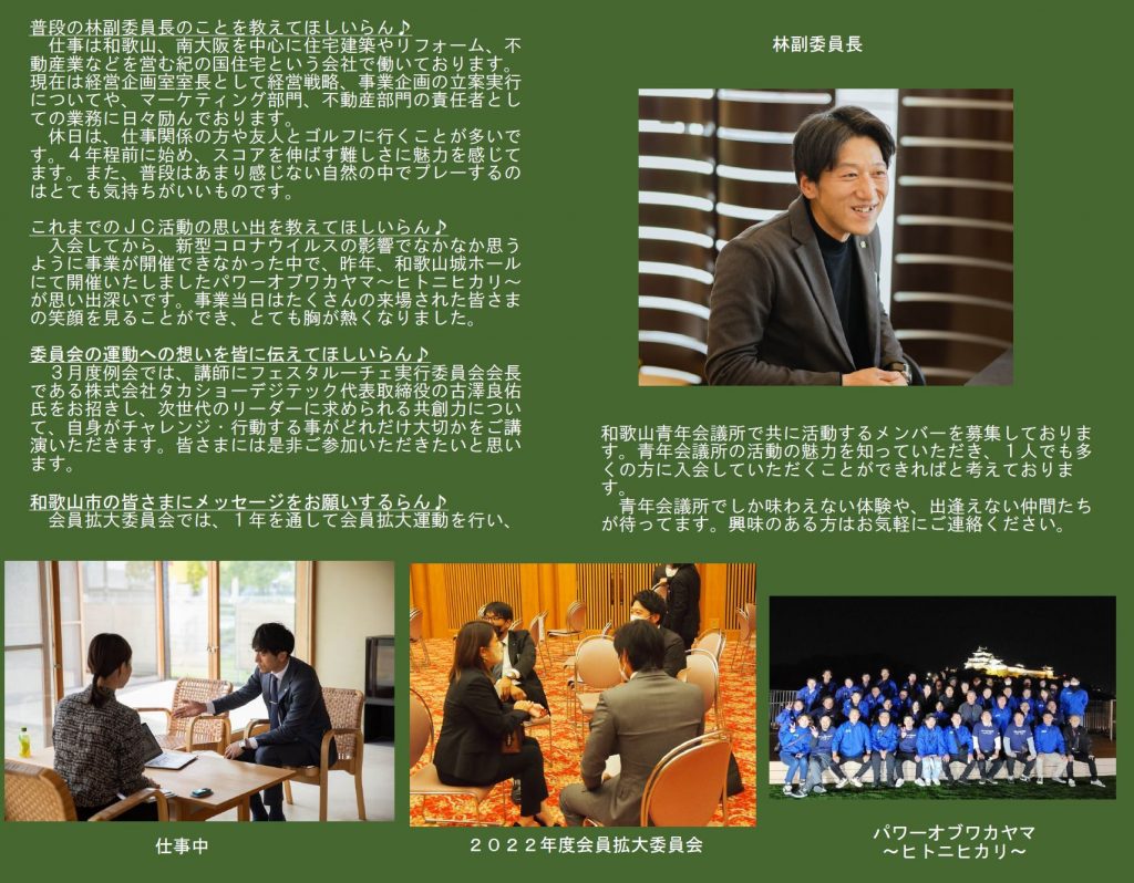本年度は「わとらんインタビュー」と題し、和歌山青年会議所のメンバーにわとらんがお話を伺って、担当事業や青年会議所運動への意気込みを紹介します。