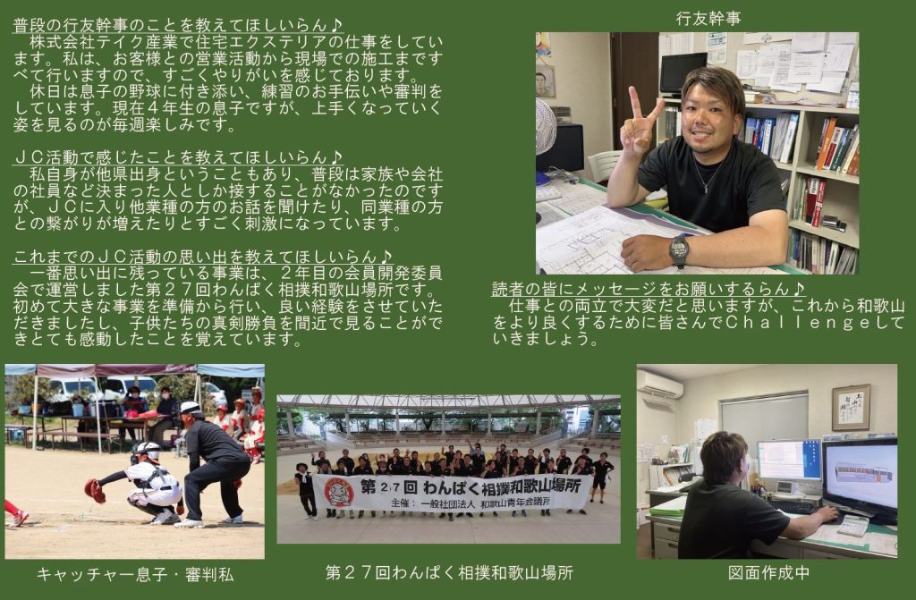 本年度は「わとらんインタビュー」と題し、和歌山青年会議所のメンバーにわとらんがお話を伺って、担当事業や青年会議所運動への意気込みを紹介します。今回は、 財政規則審査会議 幹事 行友大樹君にお話を伺います 。