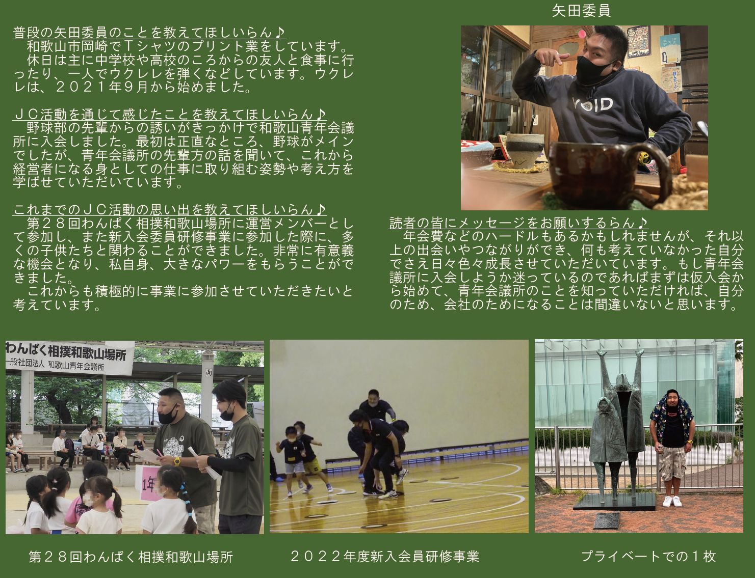 本年度は「わとらんインタビュー」と題し、和歌山青年会議所のメンバーにわとらんがお話を伺って、担当事業や青年会議所運動への意気込みを紹介します。今回は、会員開発委員会 委員 矢田聖人君にお話を伺います 。