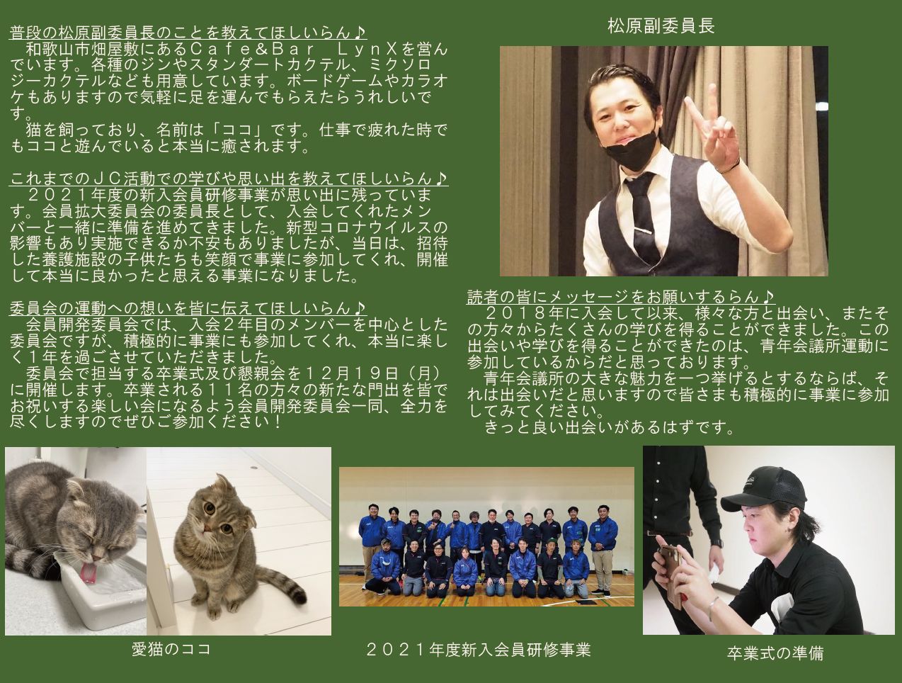 本年度は「わとらんインタビュー」と題し、和歌山青年会議所のメンバーにわとらんがお話を伺って、担当事業や青年会議所運動への意気込みを紹介します。今回は、会員開発委員会 副委員長 松原 翔太君にお話を伺います 。
