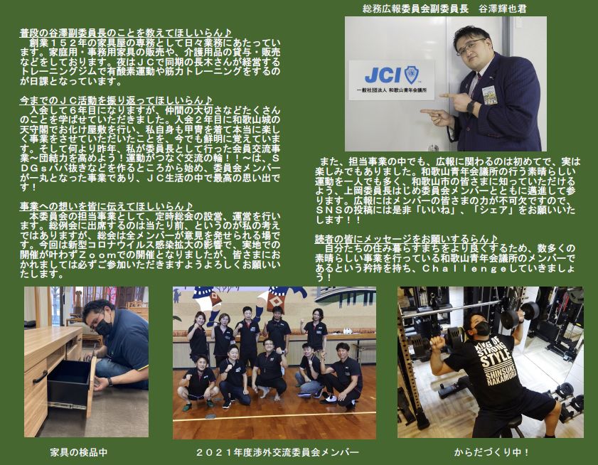 本年度は「わとらんインタビュー」と題し、和歌山青年会議所のメンバーにわとらんがお話を伺って、担当事業や青年会議所運動への意気込みを紹介します。今回は、総務広報委員会副委員長 谷澤輝也君にお話を伺います 。