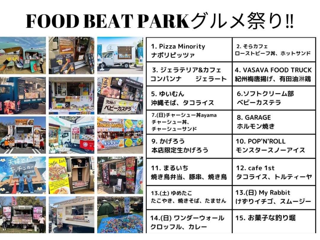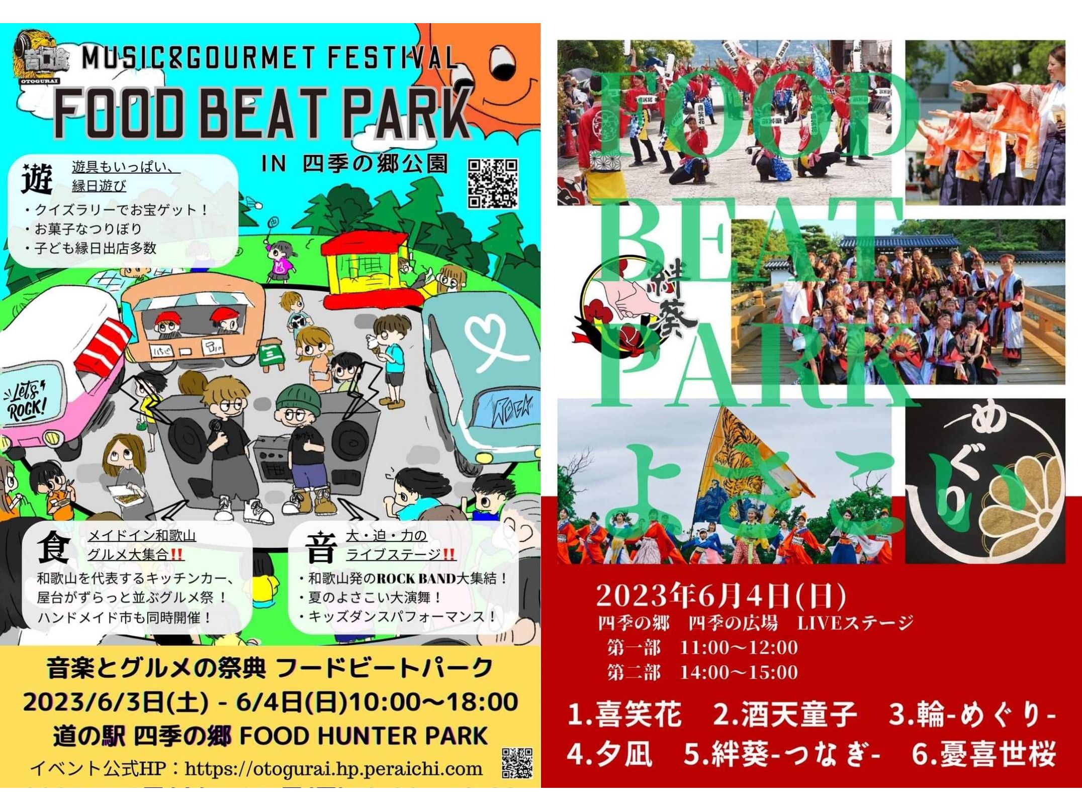 小舟潮:和歌山ではいつもいろんなイベントがやっててみんなで和歌山を盛り上げようとがんばってるんよー。「道の駅 四季の郷公園」FOOD HUNTER PARKで6月3日(土)、4日(日)10:00~18:00に「音楽とグルメの祭典フードビートパーク」がオトグライさん主催で開催されるんやで!