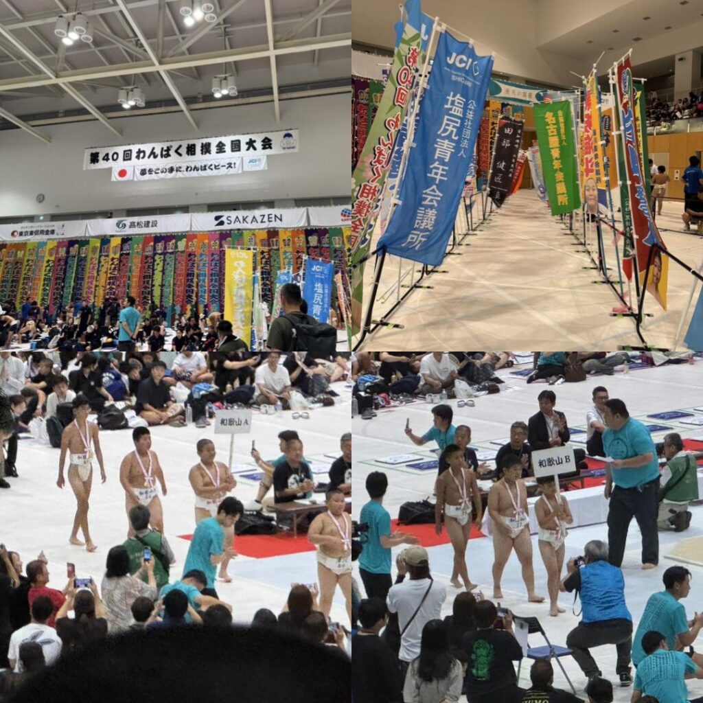 第40回わんぱく相撲全国大会に参加してまいりました。今大会には和歌山県を代表して4,5,6,年生の総勢6名が参加し、和歌山場所からは、4年生横綱の山下蓮人さん、5年生横綱の山本都聖さん、6年生横綱の大西斗真さんの3人が全国大会に出場し雌雄を決して邁進しました。3人共に全力で相撲を取り組み4,5,6,年生の横綱達をみて全力で立ち会うことの大切さや勇気を持って進んでいく姿に感銘を受け、尊敬の念を抱きました。結果としましては、3人とも入賞はかないませんでしたが、和歌山を代表し、各都道府県を勝ち抜いた力士たちとの全力勝負を経験したこと、和歌山代表チームとしてともに励んだことなど、たくさんのかけがえのない学びの場となったことと確信いたしました。和歌山場所より出場されました、3人の力士の皆さま、本当にお疲れ様でした。
