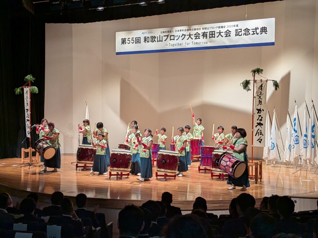 和歌山ブロック協議会総務委員会は6月28日(土)有田川町 きびドームにて、第55回和歌山ブロック大会有田大会記念式典を開催させていただきました。オープニングパフォーマンスにて、清流太鼓かなや伝々の皆さまに演奏いただきました。1997 年より有田川町(旧:金屋町)で 女性の和太鼓チームとして地域活性のために活躍されています。女性の優しさと強さ、有田川の流れを和太鼓に託して表現する演奏は圧巻でした。