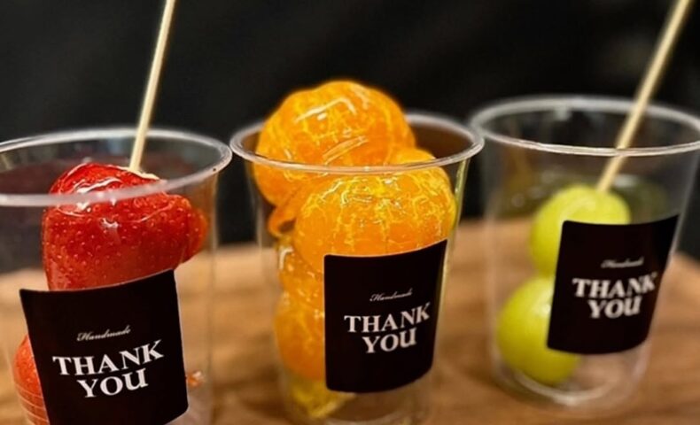 COLORFULさんからは、カットりんご飴。りんご飴は直前まで冷やし、オーダー後にカットします。パリパリ、シャキシャキなカットりんご飴を是非食べてみてください。他のフルーツ飴もあります!