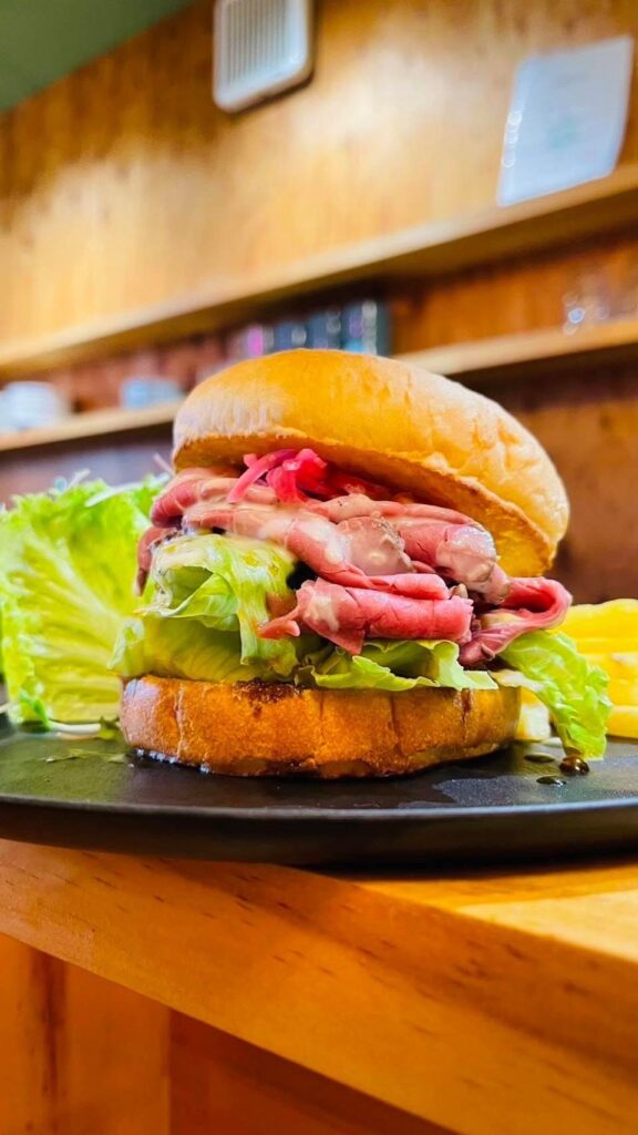 まぶキッチンさんからは、ローストビーフバーガーをご紹介。シャキシャキレタスにしっとり柔らかいローストビーフ、2種のソースとバンズに塗ったマスタードマヨネーズ、アクセントの赤玉ねぎがすごーくバランスの整った美味しさです。是非一度ご賞味あれ、ハマること間違いなし!