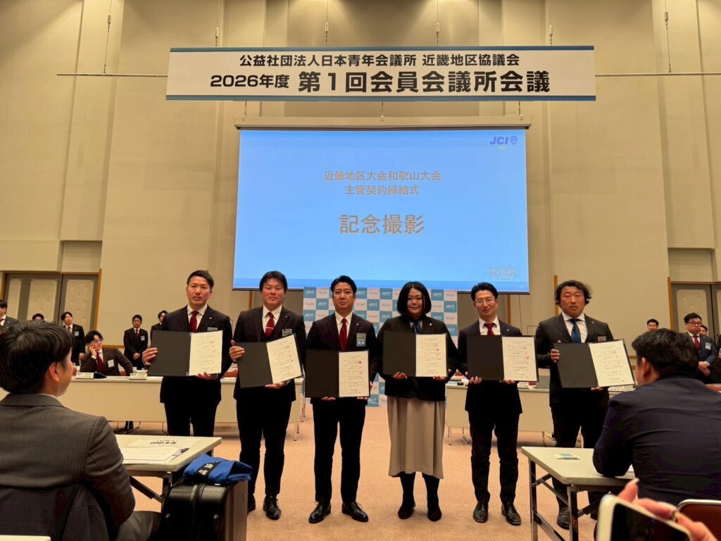 そして、今回の京都会議において、私たち和歌山JCにとって最も身の引き締まる瞬間がありました。本年開催される「2026年度 近畿地区大会 和歌山大会」の主管契約締結式が執り行われ、地元開催という大きなチャンスに向け、メンバー一丸となって突き進む決意を新たにしました。