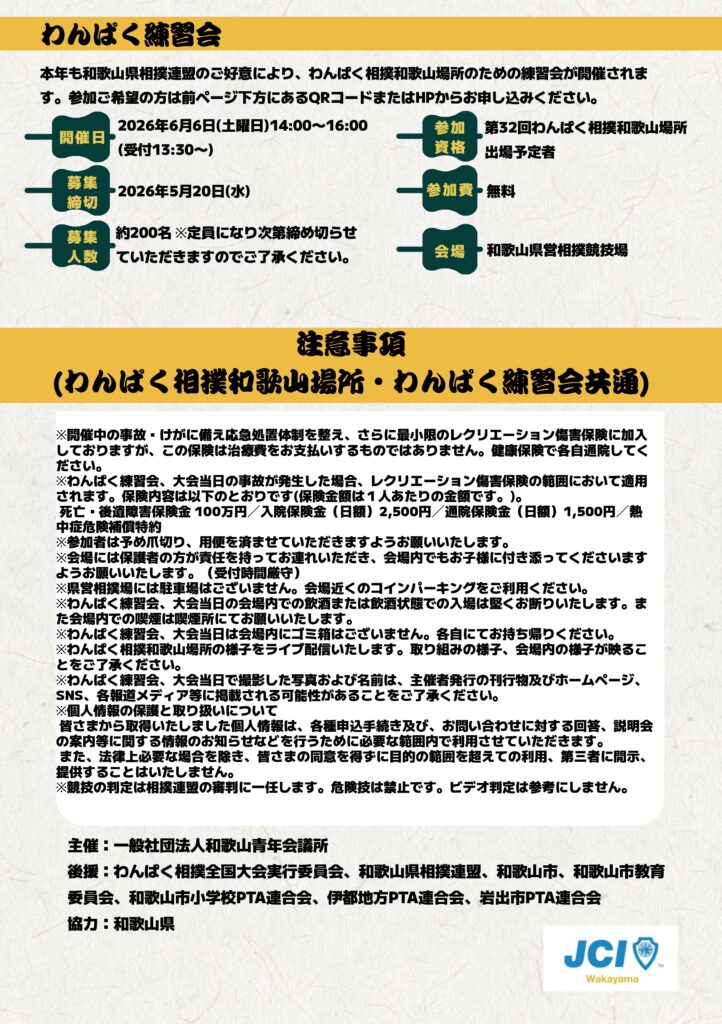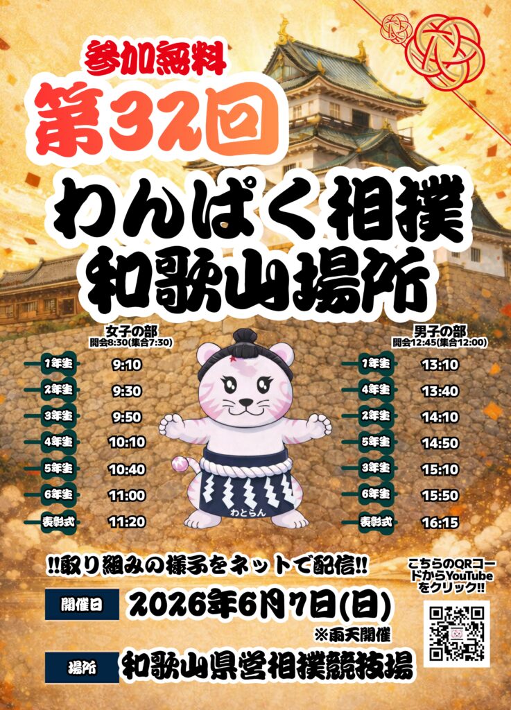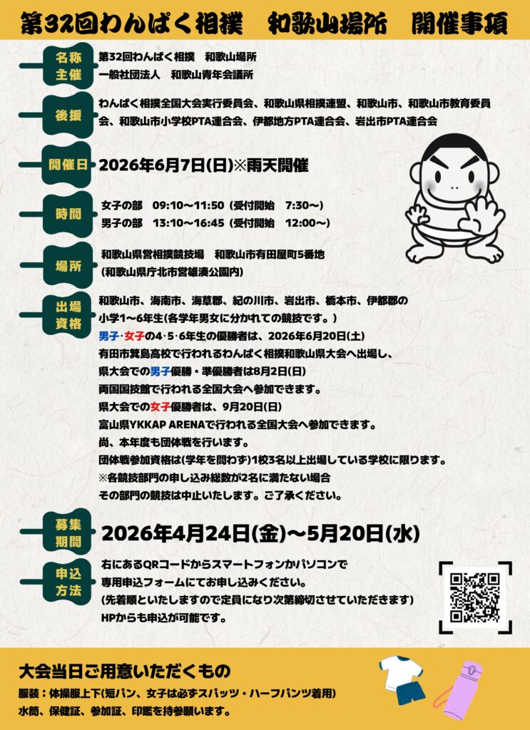 第32回わんぱく相撲和歌山場所では2026年4月24日〜5月20日までの期間、元気いっぱいのわんぱく力士を募集しています。