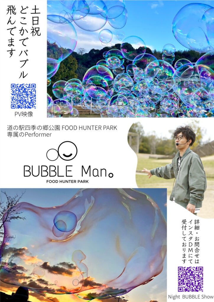 楽しくて幻想的なシャボン玉の世界を創り出す、道の駅四季の郷公園FOOD HUNTER PARKの専属パフ  ォーマー“BUBBLE Man。”がなんと、初めて和歌山城でパフォーマンスを行うことになりました!!
